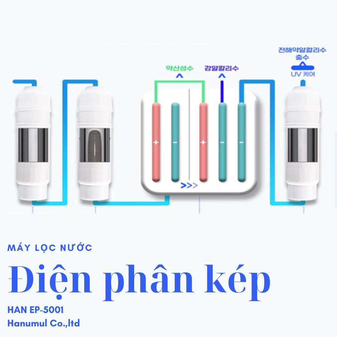 Máy lọc nước sử dụng công nghệ điện phân kép độc quyền, được cấp bằng sáng chế tại Hàn Quốc. Giúp tăng cường khả năng loại bỏ tạp chất, vi khuẩn và ổn định chất lượng nước đầu ra ở mức tối ưu.